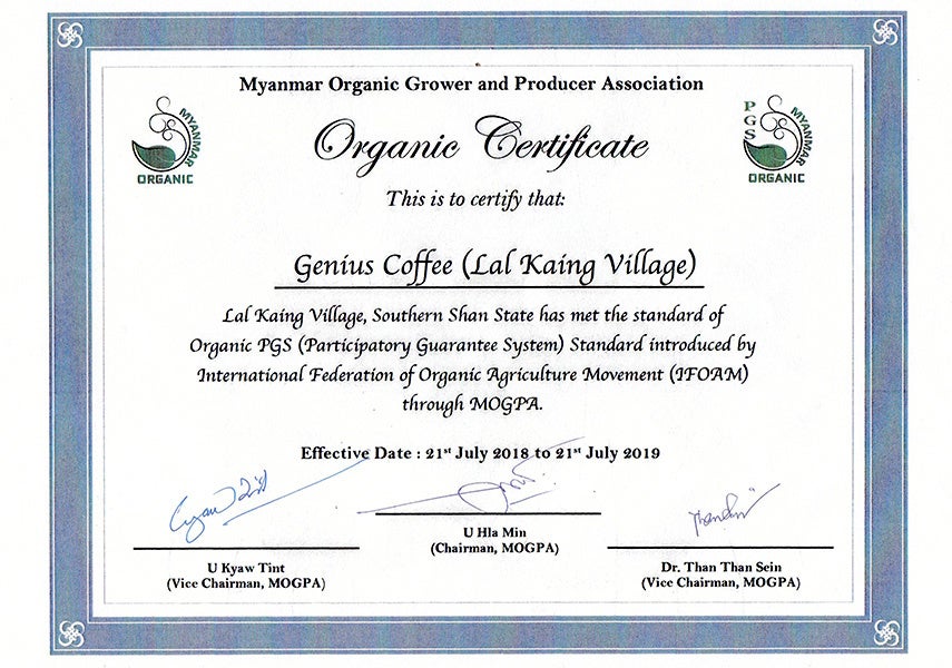 また、コーヒー豆の栽培は赤道直下で作られていますが、農園のあるラカイン村は標高が高いために豆の熟成がゆっくりと進むので香りや味がさらに良くなります。2014年にアメリカスペシャルティコーヒー協会(以下SCAA)で高評価を受けて以来、ワールドコーヒーリサーチ(以下WCR)からも84点と高い評価を得ています。SCAAやWCRで80点以上の点数を獲得するとスペシャルティコーヒーとして認められます。スペシャルティコーヒーとは全世界生産量のうち3%しかない世界最高ランクのコーヒー豆のことです。しかもその中でもオーガニックでもあるコーヒーとなると大変貴重なコーヒーになります。
