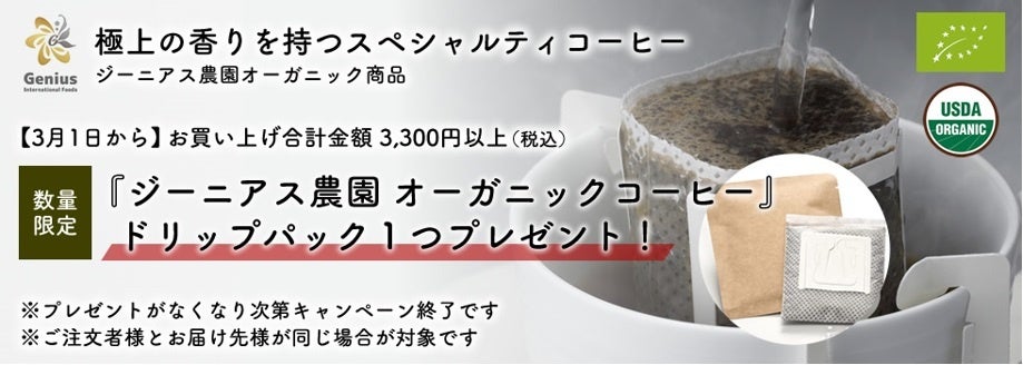 にて、お買い上げ合計金額 3,300円以上(税込)で 『ジーニアス農園 オーガニックコーヒー』のドリップパックを1つプレゼントいたします。(※数量限定なくなり次第キャンペーンは終了)