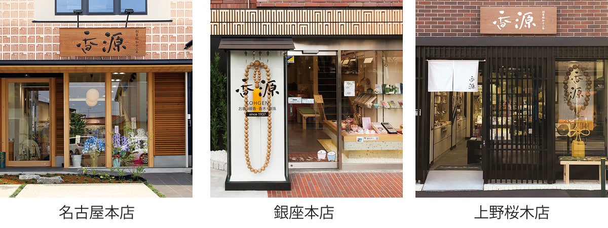 香源店舗(名古屋・銀座・上野桜木町)とオンラインショップ(https://www.kohgen.com/)