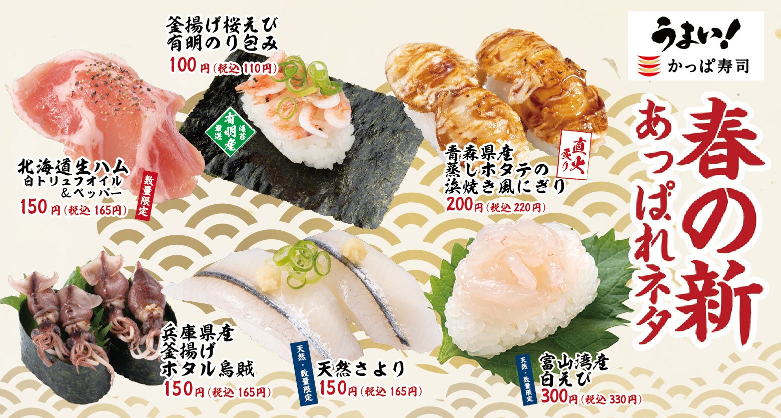 かっぱ寿司春メニューの定番といってもいい『富山湾産 白えび』が今春も登場です!淡い桜色の小さな体には上品で濃厚な甘みがギュッとつまっております。他にも、春を告げる魚で知られるキラキラきれいな『天然さより』にぷりっとした身とワタの旨みがたまらない『兵庫県産 釜揚げホタル烏賊』などこちらもお見逃しなく!