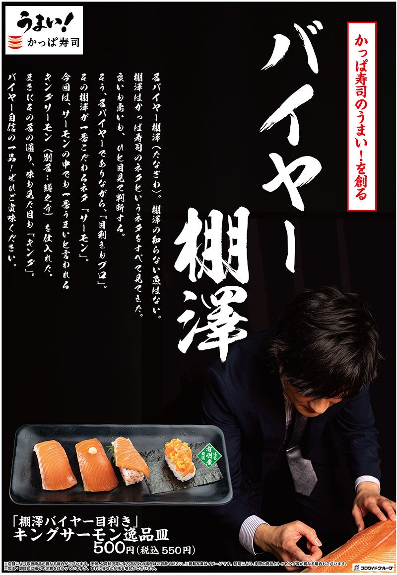 | ~魚の名バイヤー・棚澤和之(たなざわかずゆき)~ 20年前にかっぱ寿司に入社し店舗勤務の後、バイヤーとして活躍。バイヤー歴12年となるその手腕は、サーモンをはじめ、魚卵・甲殻類などかっぱ寿司で提供している多くのネタで頼りにされています。中でも、サーモンの目利きには絶対の信頼があります。一番美味しい時期に漁獲された商品を中心に調達する事をモットーに、今日もお客様へ“うまい!”をお届けしています。 ■棚澤のいちおしポイント! |