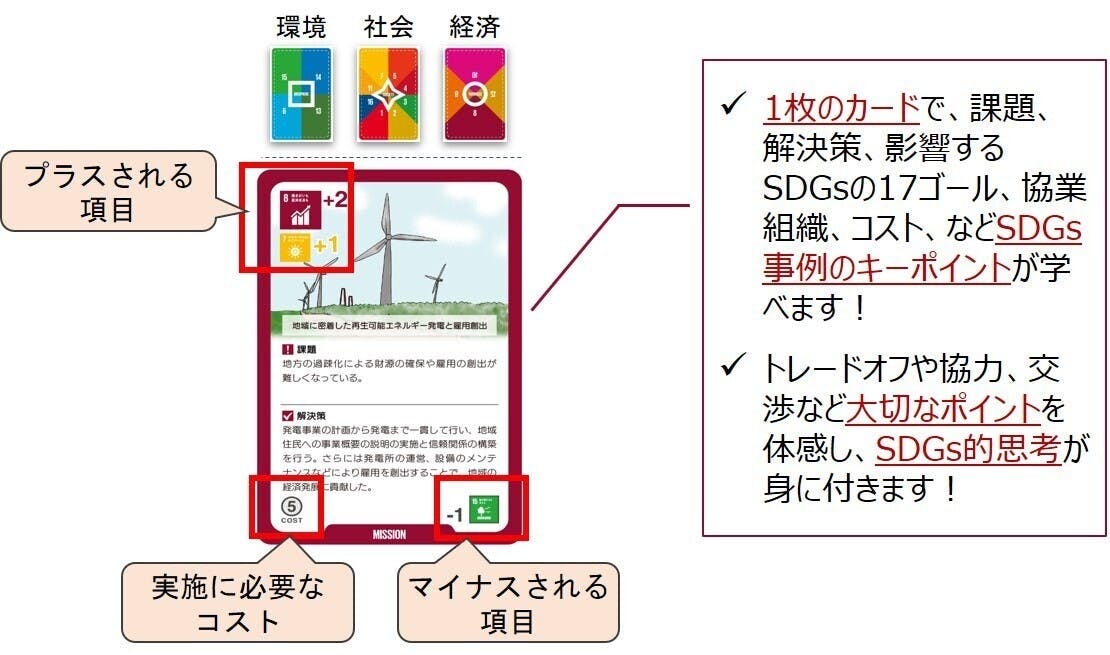 ミッションカードには、実際に取り組まれたSDGsに関する事例が、課題・解決策という形でまとめられており、楽しく事例を学ぶことができます。