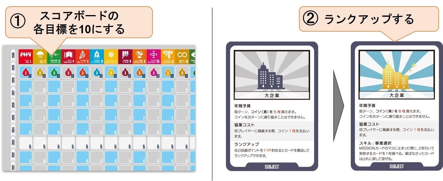 ・各プレイヤーが年間予算やSDGs達成期限の2030年までという限られた時間の中で、次の2つのゴールを目指します。