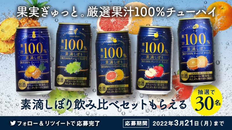 - 「素滴しぼり果汁100 %チューハイ【 公式 】」Twitterアカウント(https://twitter.com/sutekishibori)をフォロー