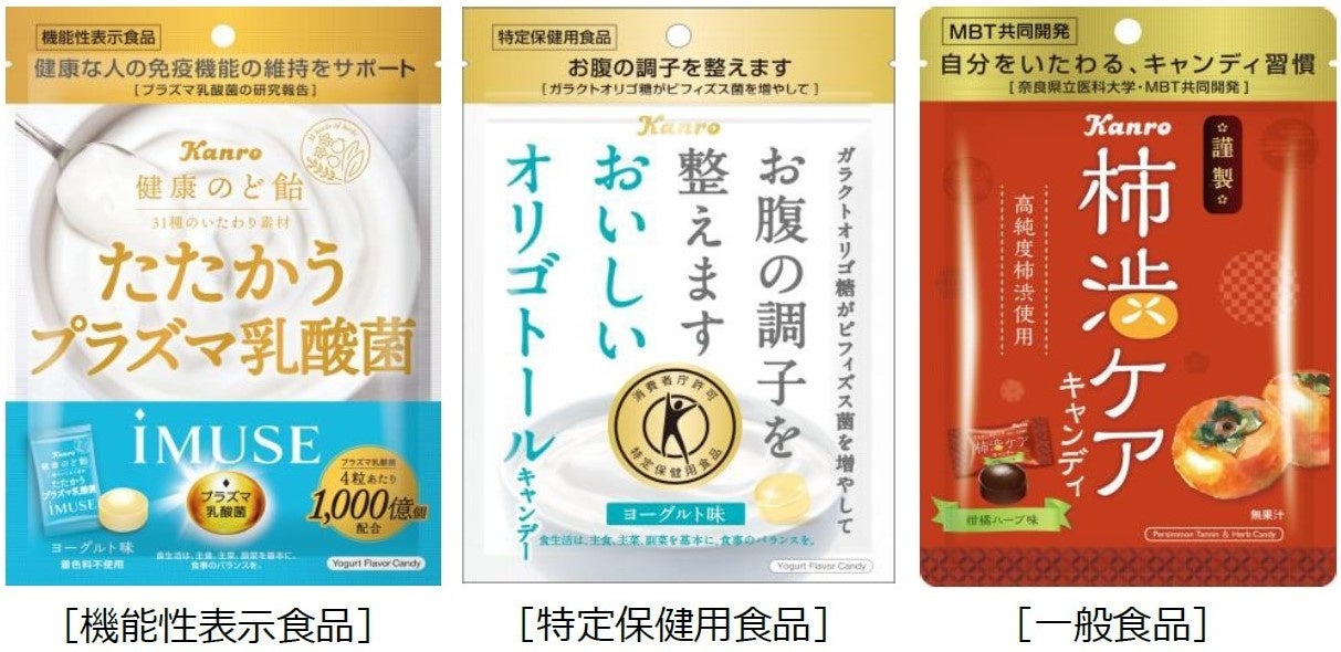 体調管理への意識がますます高まっている昨今。「おいしいオリゴトールキャンデー」は、いつでもどこでも手軽においしく食べられて、自身をいたわれるキャンディとして、パッケージをリニューアルいたしました。上部に金色の帯で統一感のあるデザインとし、一目で”健康意識のニーズ向け商品”とわかるようなデザインとなっています。また「健康のど飴たたかうプラズマ乳酸菌iMUSE」も同様のデザインで新発売いたしました。わかりやすく表示することによって、お客様のニーズに合った商品選択ができるようになっています。