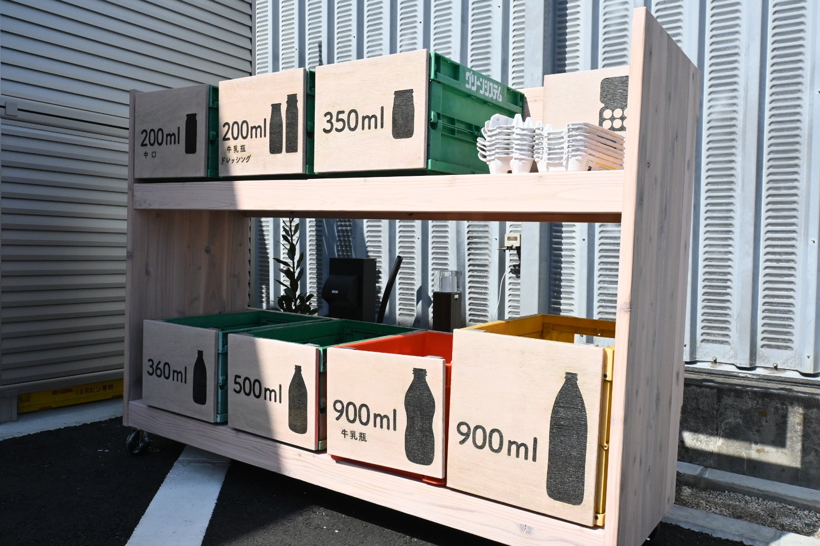 【リユースびんの回収ボックス】使用済みのびんは店舗で回収し再利用。