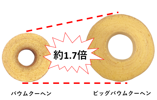 レギュラー商品の「バウムクーヘン」と比べ、約1.7倍のボリュームを誇るビッグなバウムクーヘンに仕上げました。期待を裏切らない満足感あふれる商品になっております。