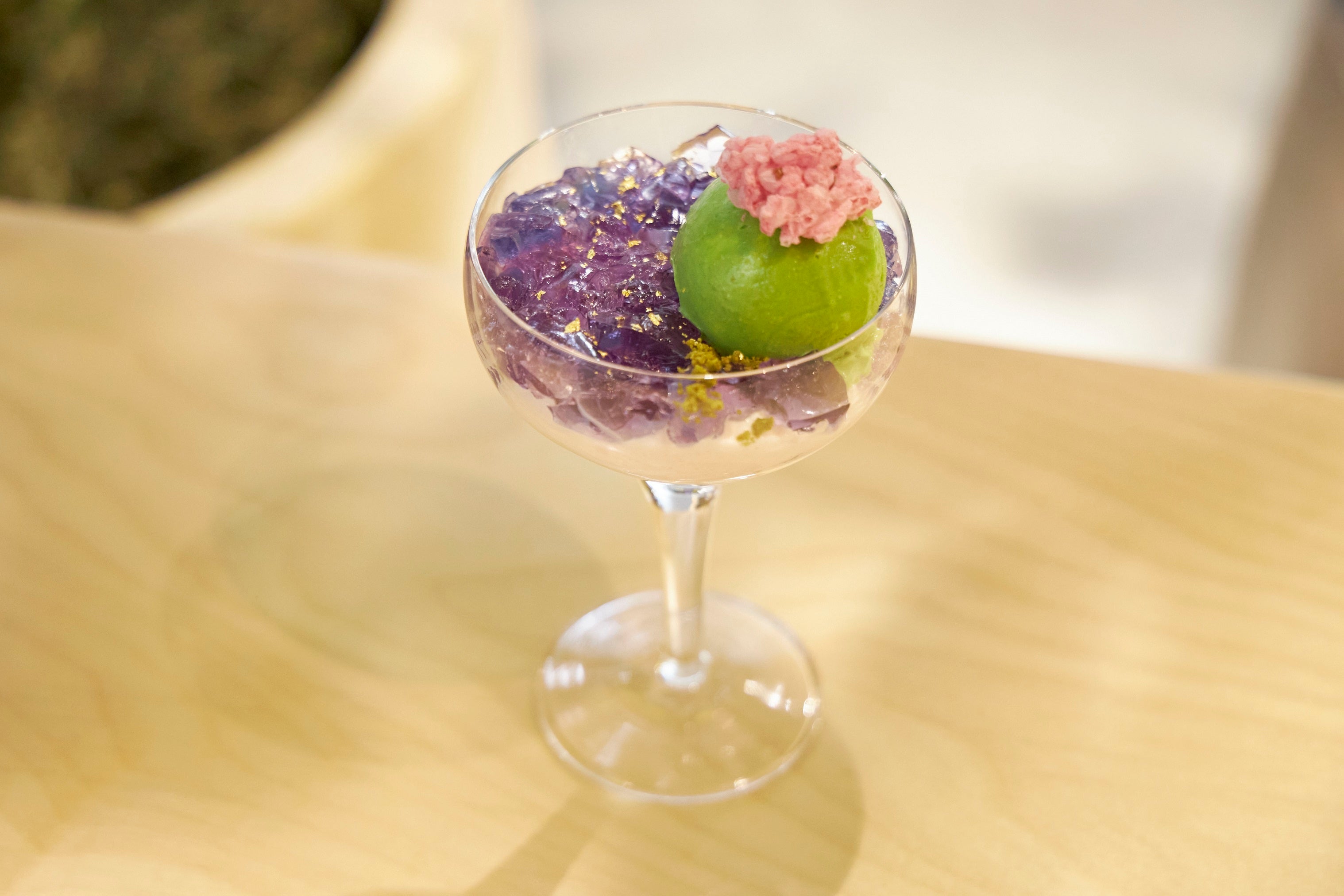 自家製パンナコッタに夜桜をイメージしたバタフライピーとクラフトジンのゼリーをのせ、青木農園のカーボロネロを使ったALL GOOD STOREのジェラートを合わせた逸品。