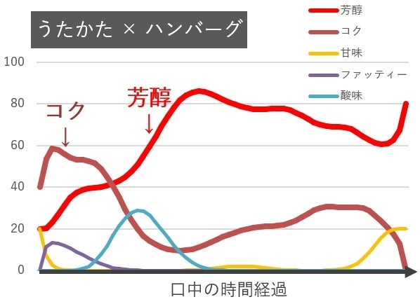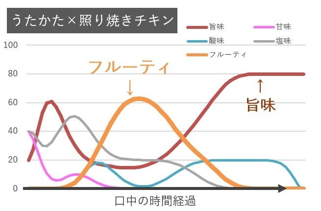 グラフ縦軸は印象的な味覚の選択率(強さに相関)、横軸は口に含んでから飲みこんだ後の余韻までの時間経過を表しています。