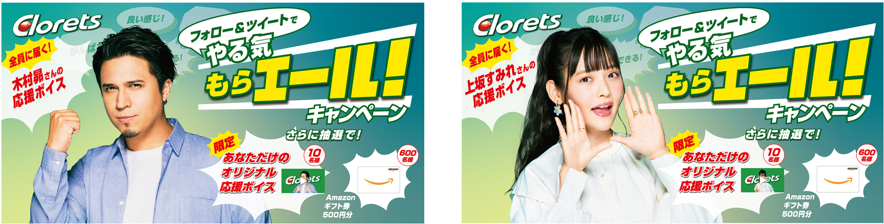 モンデリーズ・ジャパン株式会社(本社:東京都品川区 / 代表取締役社長:福本千秋)は、息スッキリの「クロレッツ」ブランドの新TVCM放映開始を記念して、「クロレッツ」の新イメージキャラクターを務める博多華丸・大吉さんに加え、人気声優の木村昴さん・上坂すみれさんを起用した「やる気もらエール!キャンペーン」を、2022年3月7日(月)から開始します。本キャンペーンでは、クロレッツの公式Twitter(@Clorets_jp)のフォロー&ツイートで誰でも参加できるキャンペーンと、クロレッツを買って応募するキャンペーンを同時に実施します。