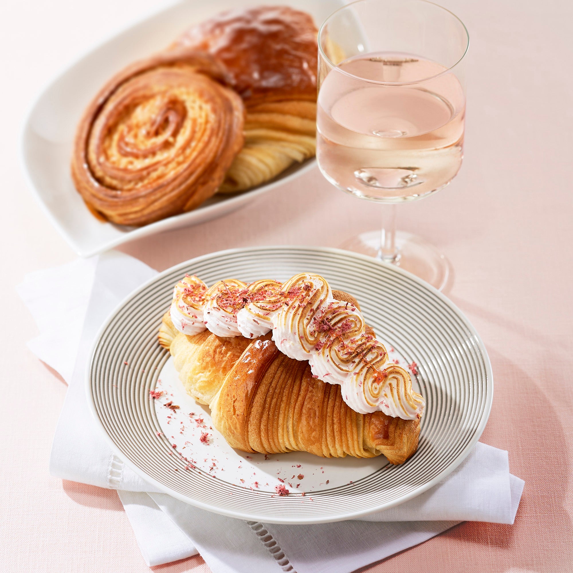 フランス南部、プロヴァンス地方のコート・ド・プロヴァンス産ロゼワインをペアリング。フルーティーな味わいとやや辛口のすっきりとした爽快感が、クロワッサンの糖分と絶妙にマッチします。