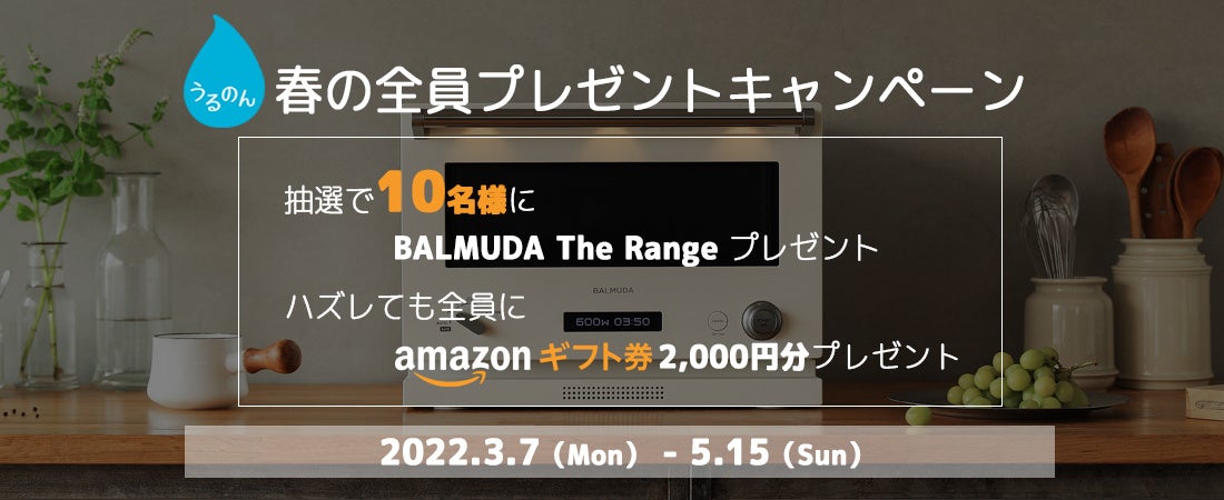 株式会社TOKAI(本社:静岡県静岡市、代表取締役:小栗勝男、以下TOKAI)が提供する、宅配水サービス「おいしい水の贈りもの うるのん」(以下、うるのん)は、2022年3月7日(月)~2022年5月15日(日)までの期間、『春の全員プレゼントキャンペーン』を開催いたします。該当期間内に公式HPから「うるのん」にお申込みいただいた方の中から抽選で10名様に「BALMUDA The Range」をプレゼント!抽選にハズレてしまった方にもAmazonギフト券2,000円分をプレゼントします。
