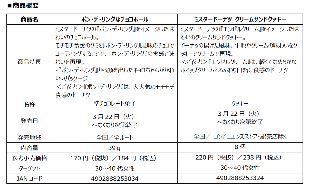 森永製菓株式会社(東京都港区芝、代表取締役社長・太田 栄二郎)は、株式会社ダスキン(本社:大阪府吹田市、代表取締役社長・山村 輝治)が運営する大人気ドーナツ店『ミスタードーナツ』のドーナツをイメージしたチョコボールや小枝、クッキーなどを、3月22日(火)より期間限定で発売いたします。
