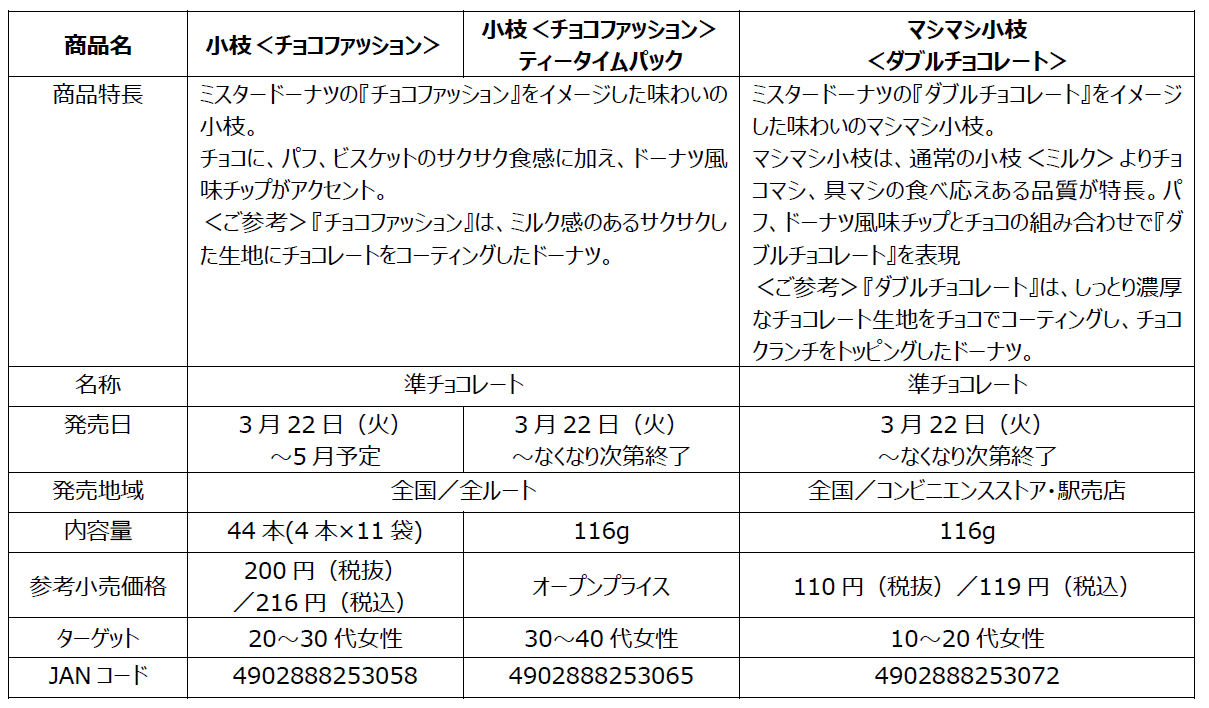 それぞれのドーナツの味わいや食感を、チョコボールや小枝、クッキーの美味しさと組み合わせることで、驚きと楽しさのある美味しい商品が実現できました。『ポン・デ・リング』をイメージしたモチモチ食感のチョコボール「ポン・デ・リングなチョコボール」、『エンゼルクリーム』をイメージした優しい味わいのクッキー「ミスタードーナツ クリームサンドクッキー」、『チョコファッション』をイメージしたサクサクした食感の小枝「小枝<チョコファッション>」、『ダブルチョコレート』をイメージした濃厚なチョコ感のマシマシ小枝「マシマシ小枝<ダブルチョコレート>」です。風味や食感の再現性、美味しさをドーナツと食べ比べても楽しめる商品です。森永製菓とダスキンの共同開発で、ドーナツをチョコボールや小枝、クッキーで表現するという夢のコラボレーションを実現することで、菓子市場を盛り上げてまいります。