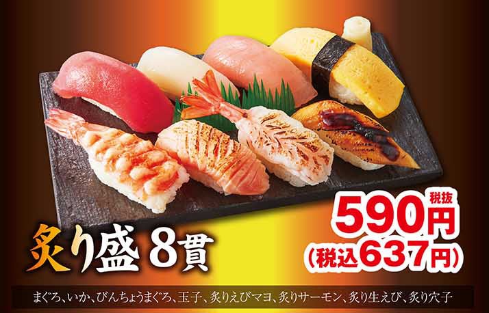 人気の「炙りサーモン」「炙り生エビ」が入った8貫盛。