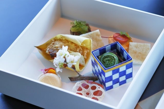 「濱手箱」は国の名勝に指定された神奈川県横浜市の日本庭園「三渓園」をイメージした箱庭のお重です。三渓園公認の本メニューの特徴は、チョコブロックに抹茶の粉をふり、苔むした岩に見立てています。季節を感じる干菓子を愛でながら、三渓園の春の息吹をお感じいただけます。