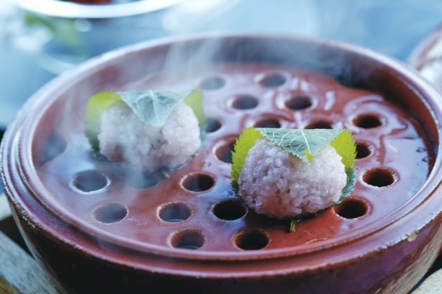 道明寺の桜餅(4月)は、蒸し器の蓋を開けると、桜の葉の香りがふわりと立ち上ります。抹茶と共にお召し上がりください。