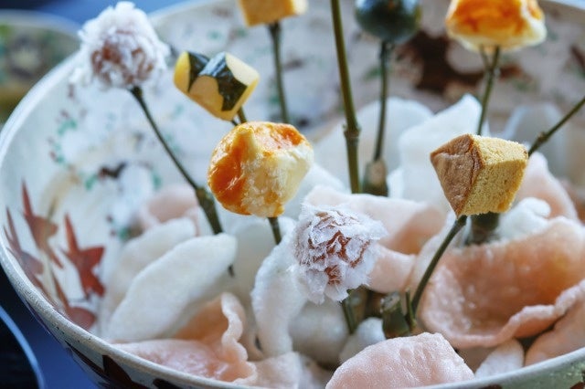 花が咲き、心華やぐ島台には5種類の甘味が愛らしく並びます。緑茶が香るシロップと寒天が涼やかな「緑茶の寒天」、本蕨粉、黒糖、シナモンがほのかに香り、青大豆粉をまぶした「黒糖わらび餅」、桜のリキュールで香りづけた「炭酸ゼリーと季節の果物」、ミント風味の「フルーツトマトのコンポート」、卵の風味がよい「恵寿卵のプリン」、神奈川の酒蔵の米麹を使用した自家製の甘酒と果物が一堂に会します。