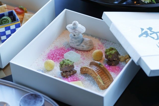 「濱手箱」は国の名勝に指定された神奈川県横浜市の日本庭園「三渓園」をイメージした箱庭のお重です。三渓園公認の本メニューの特徴は、チョコブロックに抹茶の粉をふり、苔むした岩に見立てています。季節を感じる干菓子を愛でながら、三渓園の春の息吹をお感じいただけます。