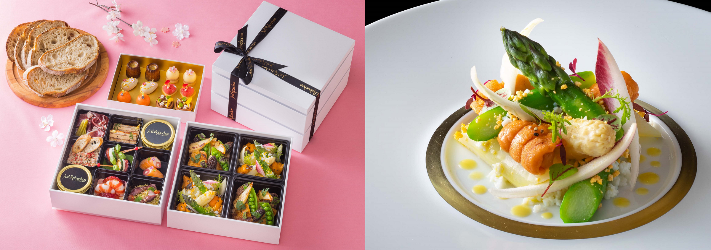 今回の『春のガストロノミー グルメボックス』は、前菜にはジョエル・ロブションのスペシャリテ「キャビア アンぺリアル ロブションスタイル」をはじめ、スペインイベリコ豚の生ハムや車エビ、旬のホタルイカなどを使用した全8種の盛り合わせ、サラダには旬のグリーンアスパラガスを使用した「アスパラガスのミモザ仕立て 雲丹を添えて」、メイン料理にはフランス産ヴォライユジョーヌのローストに旬のタケノコやモリーユ茸を添えた「フランス ランド産 ヴォライユジョーヌのローストとモリーユ茸をシャトーシャロンのソースと共に」をご用意。デザートには桜の香りを閉じ込めたチーズボールなど、レストランでも提供している小菓子6種をご用意しております。
