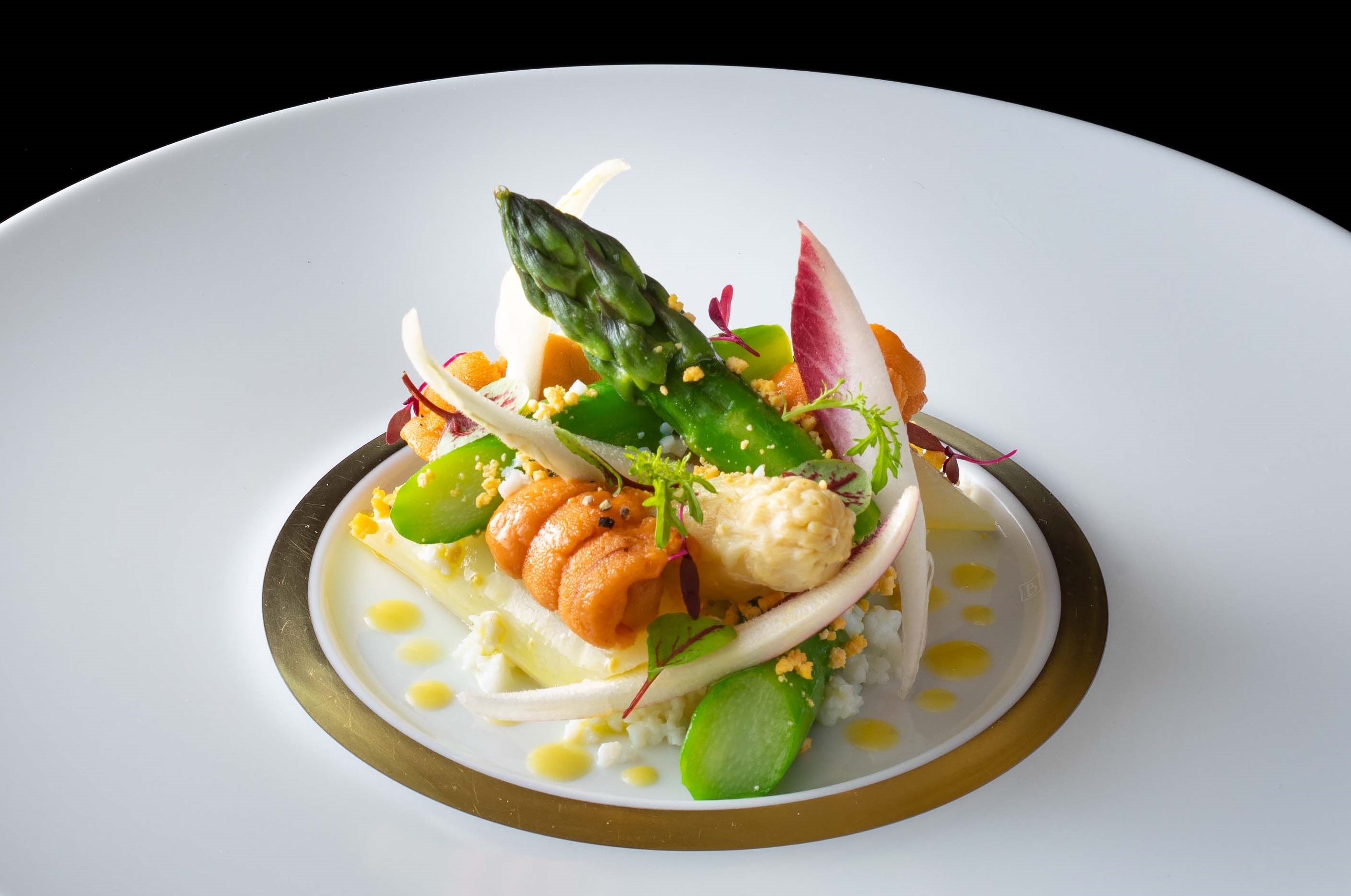 サラダは、旬のグリーンアスパラガスとホワイトアスパラガスを茹で、ミモザ風に仕上げ、たっぷりの雲丹をあしらった一品です。