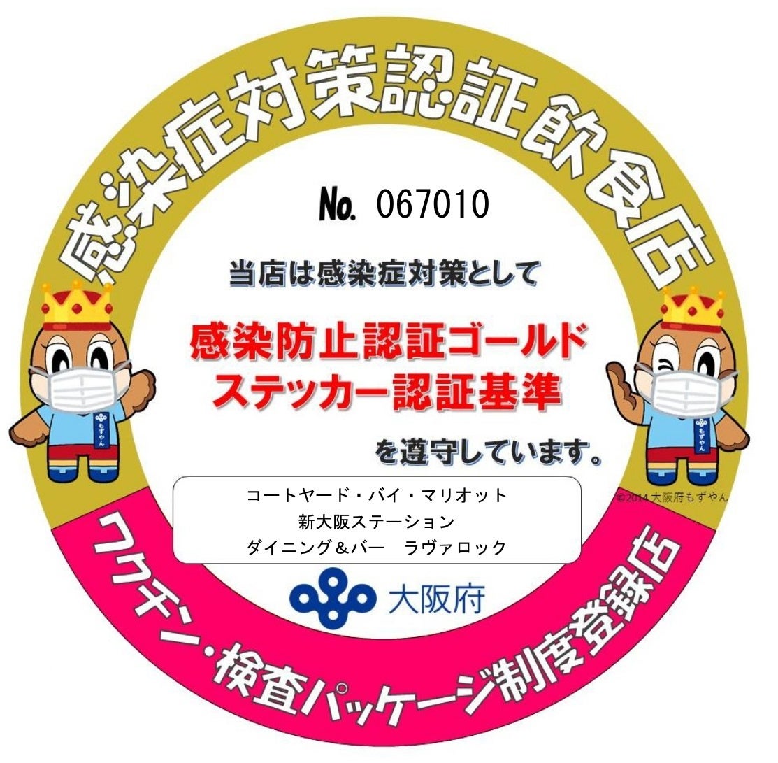コートヤード・バイ・マリオット 新大阪ステーションでは、すべてのお客様の健康と安全を最優先に「三密回避」「徹底した衛生管理」「従業員の健康管理」に取り組む当社ガイドラインを遵守し、ホテル運営を行っております。レストラン&バーでは、大阪府が推奨する「感染に強い飲食店に向けて」の取り組みを実施し、「感染対策が取られているお店」としてのチェック項目をクリアいたしております。