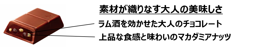 マカダミアナッツとレーズン、お酒のアクセントが楽しめる大人の洋酒チョコレートです。洋酒と相性の良いマカダミアナッツとレーズンの2種類の食感とラム酒のハーモニーをお楽しみください。