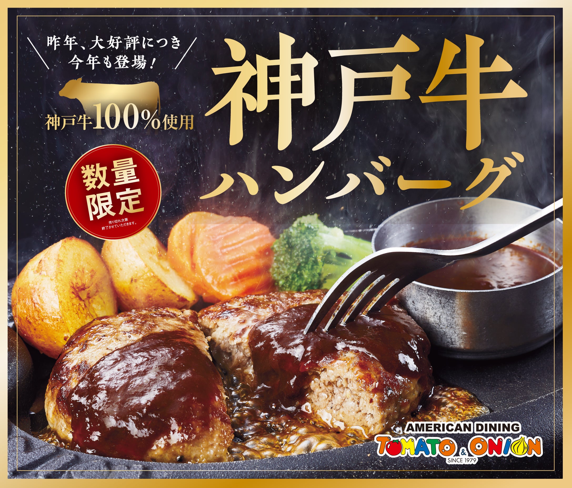 株式会社トマトアンドアソシエイツ(本社:兵庫県西宮市、代表取締役社長:小林 大二)が運営する、アメリカンダイニング「トマト&オニオン」では、2022年3月10日(木)から、神戸牛を100%使用した“神戸牛ハンバーグ”を数量限定で販売します。