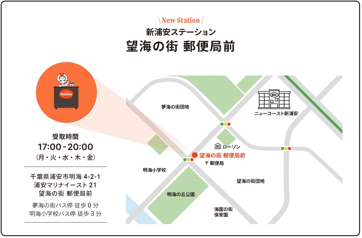 株式会社マチルダ(代表取締役:丸山 由佳、本社:東京都港区、以下「マチルダ」)は、独立行政法人都市再生機構(以下、UR都市機構) の敷地、「浦安マリナイースト 21 望海の街団地内」に、3月14日(月)より家庭料理のテイクアウトステーションを設置します。