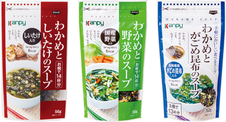 シリーズ商品として、「カンピー わかめと野菜のスープ」「カンピー わかめとがごめ昆布のスープ」も