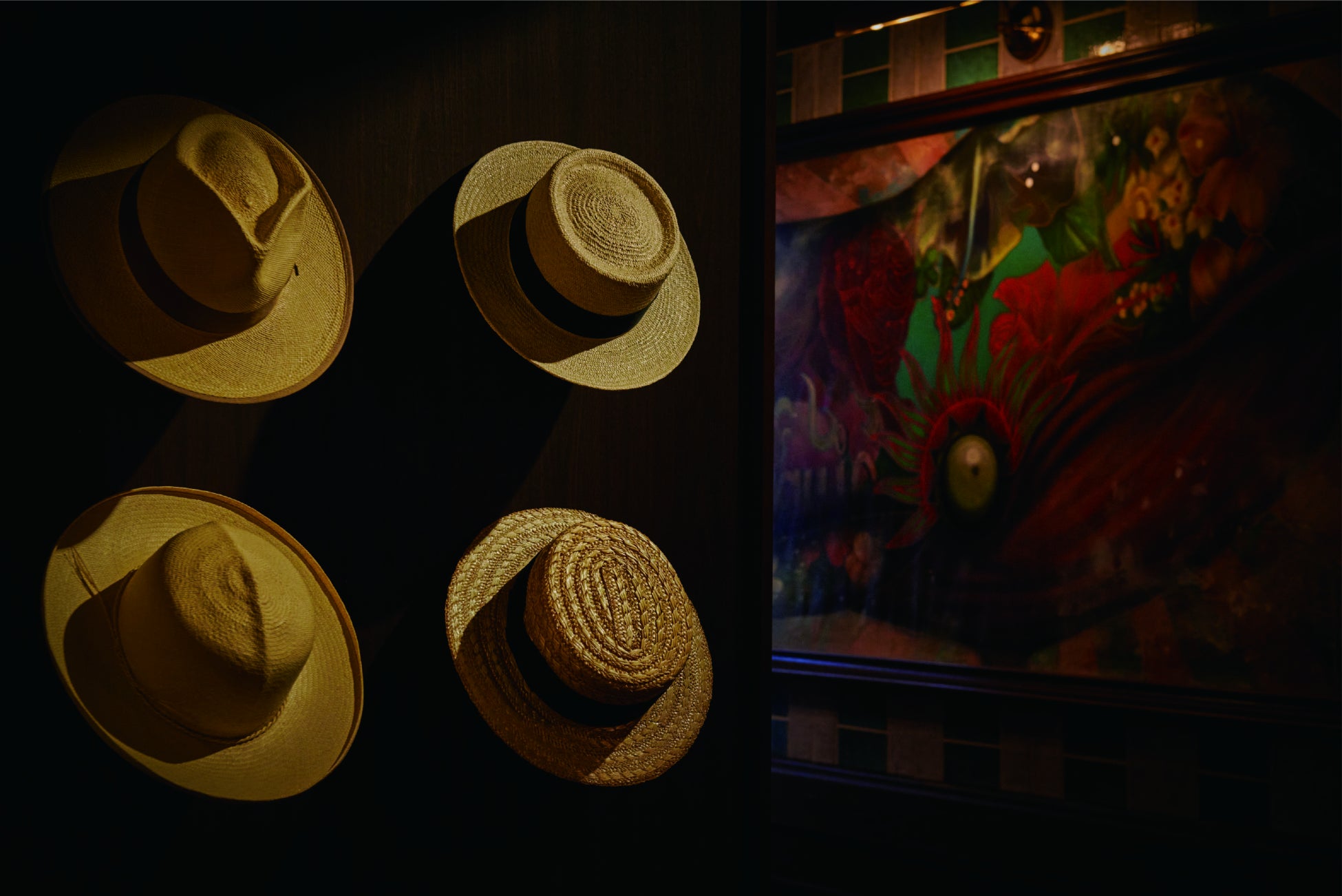 もう一つの特徴はアート。背後のスタンディングバーには沖縄伝統の染色技法による、龍やヤンバルクイナの鮮やかな紅型(びんがた)が並ぶとともに、ラテンらしさ溢れるパナマ帽のギャラリーを併設。帽子は人気テーラーThe Fat HatterにオーダーしたEl Lequioオリジナルで、実際に購入することもできます。