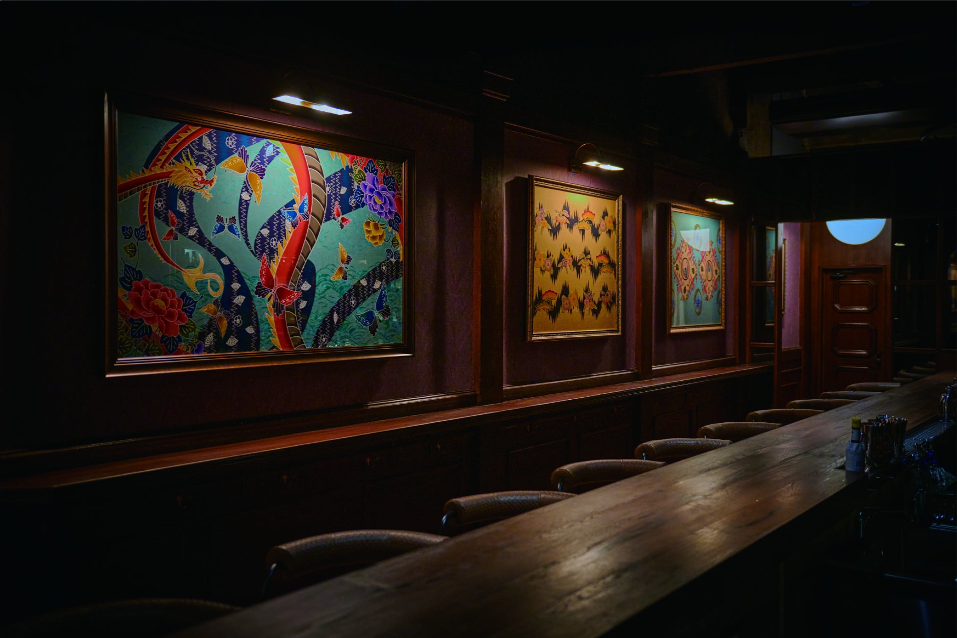 入口でゲストを迎えるピンク色の鯨の絵画は、沖縄と南米を回遊する巨大な鯨の物語を描いたもので、El Lequioの象徴。ここから中へ進むと、小さな間口からは想像のつかない約15mのロングバーが目の前に拡がります。