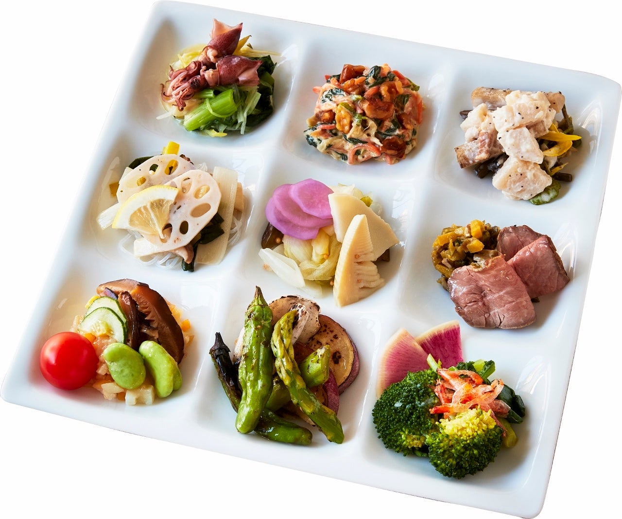 商品内容:しょっつるを使用した長芋とソテー野菜のサラダ/甘辛く味付けした野菜とローストビーフのサラダ/ほうれん草と雪下人参のサラダ 味噌マヨネーズ/ホタルイカと野菜のマリネサラダ 酢味噌マヨネーズ/ブロッコリーのマリネ 桜海老入り/筍と日野菜のピクルス/鳴門金時・里芋・ししとう・アスパラのハープ風味の焼き野菜/広島県産レモン香る 春雨サラダ/8種素材のライスサラダ 麦みそソース