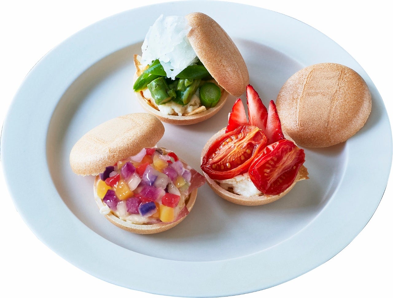 RF1と出合って約20年。常に驚きを届けてくれる大好きなブランドです。驚きと楽しさがあるサラダとは…と考え、最中を思いつきました。最中の皮は「食べられる器」、サラダをはさむとこれが美味しい!サクッと軽いおしゃれな前菜風です。