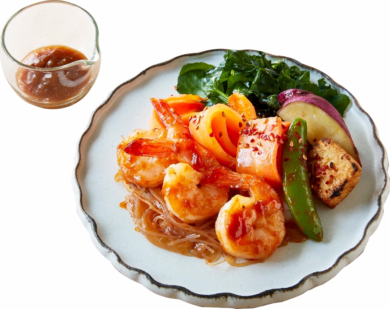 商品内容:コチュジャンを絡めたロースト海老と、食感のあるスナップエンドウ、ローストして甘みを引き出した人参・さつまいもを合わせました。加熱調理した素材の味わいが楽しめるサラダ。