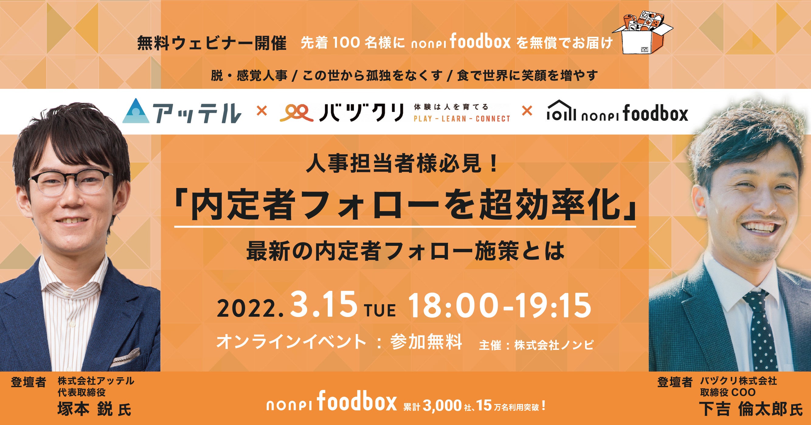“日本全国に料理と飲み物を1箱にしたフードボックス”をお届けする『nonpi foodbox™️』を展開する株式会社ノンピ(本社:東京都千代田区、代表取締役社長 :柿沼寛之)は、2022年3月15日(火)に『人事様必見!「内定者フォローを超効率化」最新の内定者フォロー施策について』ウェビナーを開催いたします。