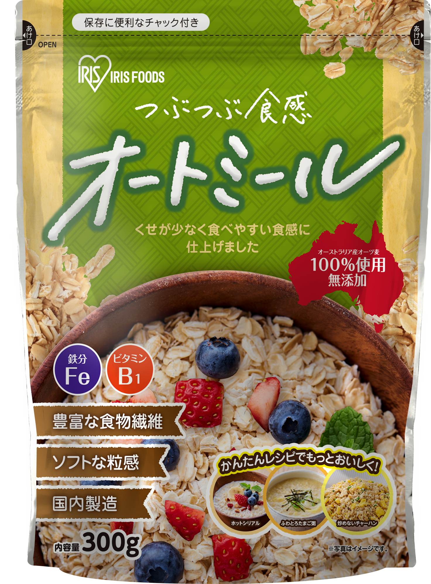 今回発売する「オートミール」は、食べやすく調理しやすいオートミールとして人気の「インスタントオーツ」を使用しているため、朝の忙しい時間などにも、電子レンジで短時間加熱するだけで簡単に調理でき、必要な栄養素を手軽に摂取できます。また、加熱処理済みのため、牛乳やヨーグルトをかけるだけでもおいしく食べられるほか、様々な料理にも活用できます。成長期に必要な栄養素が多く含まれているため、離乳食(※)や小さな子供の食事にも適しています。