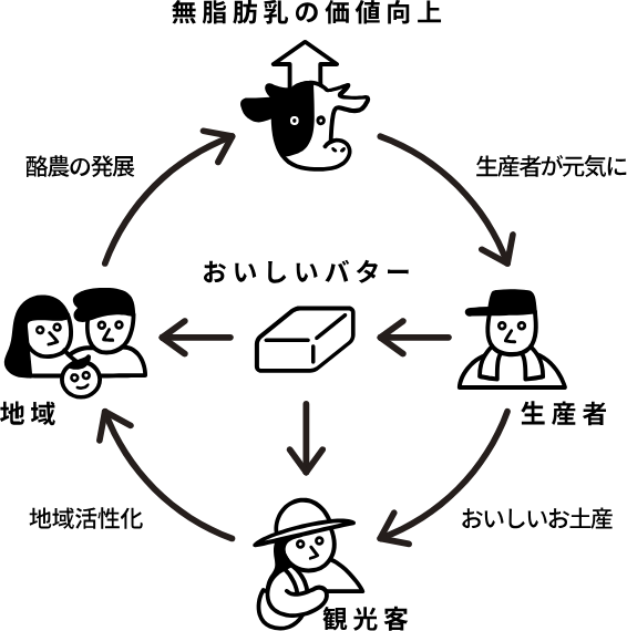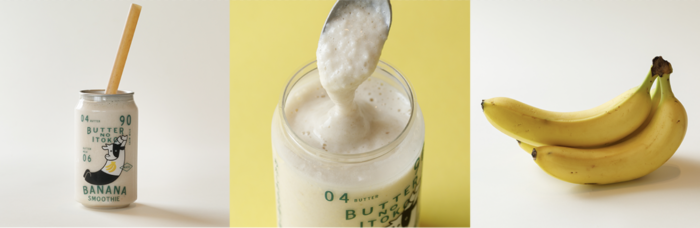 「90 バナナスムージー」の“90”は、バターを作る過程で生まれる無脂肪乳(スキムミルク)の割合を意味しています。実はバターは牛乳から5%しかとれない貴重なもの。残りの90%の無脂肪乳は、通常脂粉乳に加工して安価で販売されてしまいますが、無脂肪乳も酪農家が愛情を込めて作った牛乳の一部です。「もっとその価値を高められたら」と考え誕生した「バターのいとこ」に続き、新たに生まれたのが、この「90 バナナスムージー」。無脂肪乳を活用することで、生産者の方、観光客の方、地元の方を笑顔にする“しあわせの連鎖”が生まれ、世の食卓をより豊かにしてくれるおいしいバターを作ることにも繋がっています