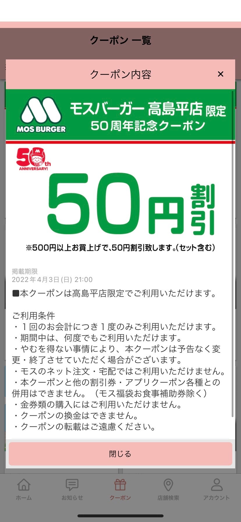 TOBU POINTアプリで配信される「モスバーガー50周年記念クーポン」を対象店舗にてお会計時にご提示いただくと、50円割引にてお買い求めいただけます。