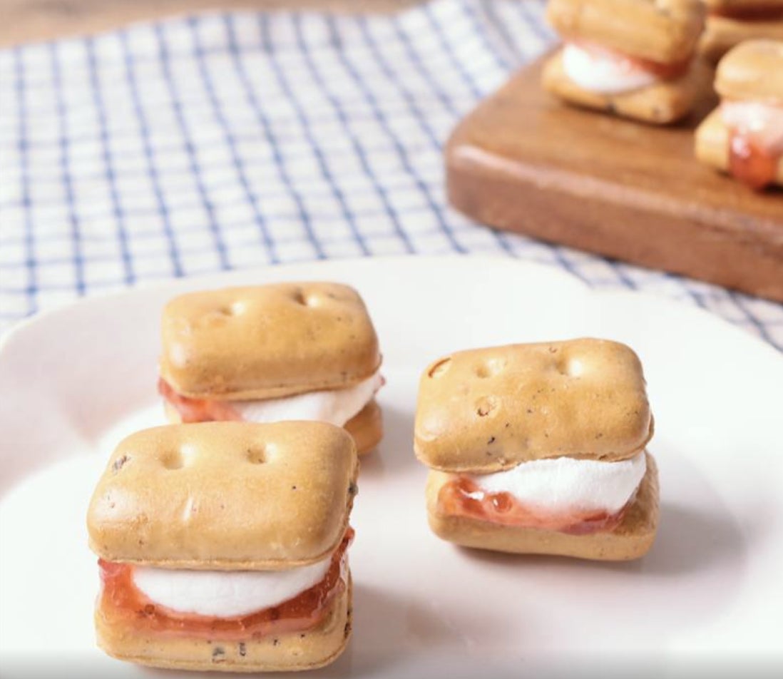 いざという時の備えで必要不可欠なものが食料であり、なかでも代表的な食料が乾パンです。乾パンは、長期保存が可能で、かつ調理要らずでエネルギーを補給することができるので、災害時に備えておくと便利な食料です。避難生活が長引くことも考えられ、精神的な不安が募りストレスが溜まることもありますよね。そんなときは、飽きずに糖分も一緒に補給できるレシピがおすすめです。日頃から食べ慣れているマシュマロとジャムを挟むだけで、お子様もお召し上がりいただけるおやつになります。