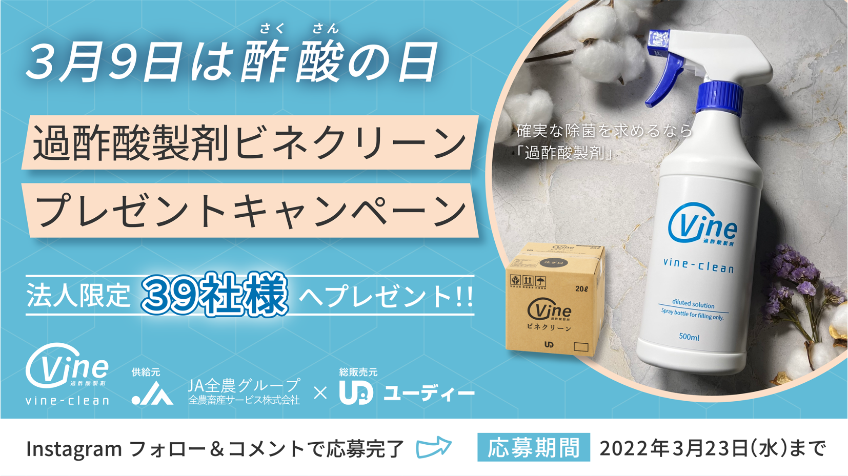 環境や動物・人に優しい自然の素材を活かした商品を手がける株式会社ユーディー(代表取締役:塚野光男、所在地:川崎市高津区)は、2022年3月9日(水)「酢酸の日」に合わせて【法人様限定】で、高水準の除菌・消臭力を持つ『過酢酸製剤ビネクリーン』のプレゼントキャンペーンを実施いたします。