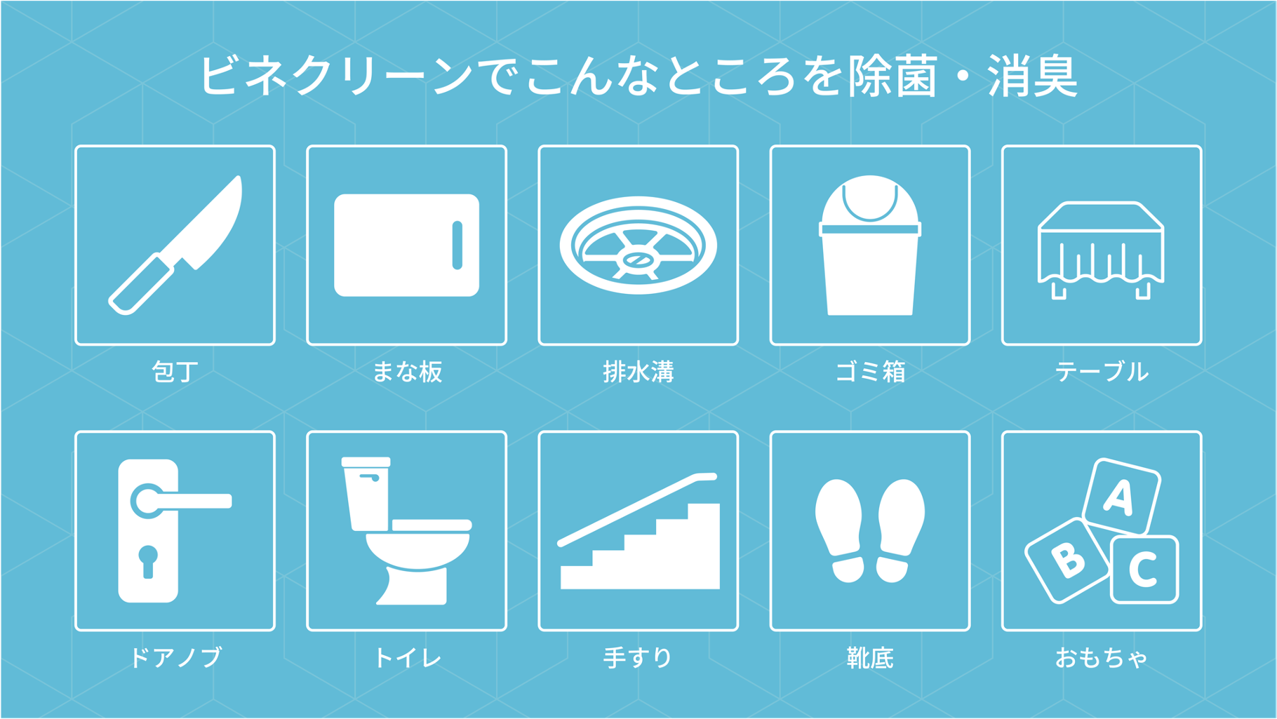 『過酢酸製剤ビネクリーン』は、ノロウイルスやカビなどの身近に潜むウイルスや細菌、食中毒の原因であるウェルシュ菌など熱湯でも死滅しない芽胞形成菌まで、幅広い病原微生物に対しての除菌効果※1があり、消臭力にも優れた除菌剤です。100%食品添加物の成分からつくられているため、小さなお子様がいる環境でも、安心してご使用いただけます。ドアノブや手すりなどの手が触れる身近な場所、飲食の現場では、調理器具はもちろん、食品表面の除菌・洗浄※2など、あらゆる場面で使用いただけます。
