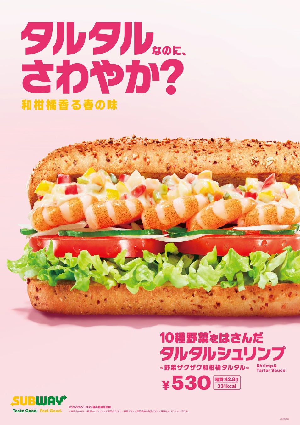 日本サブウェイ合同会社(本社:東京都品川区)が展開する サンドイッチ・チェーン『サブウェイ』は、2022年3月23日(水)より、全国のサブウェイで2種のサンドイッチ『10種野菜をはさんだタルタルシュリンプ/チキン~野菜ザクザク和柑橘タルタル~ 』を発売します。