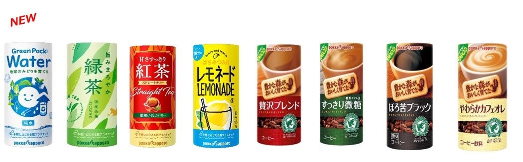 【左から】GreenPackWater、旨みまろやか緑茶、甘さすっきり紅茶、レモネードはちみつ入り、豊かな森がおいしく育てた贅沢ブレンド・すっきり微糖・ほろ苦ブラック・やわらかカフェオレ