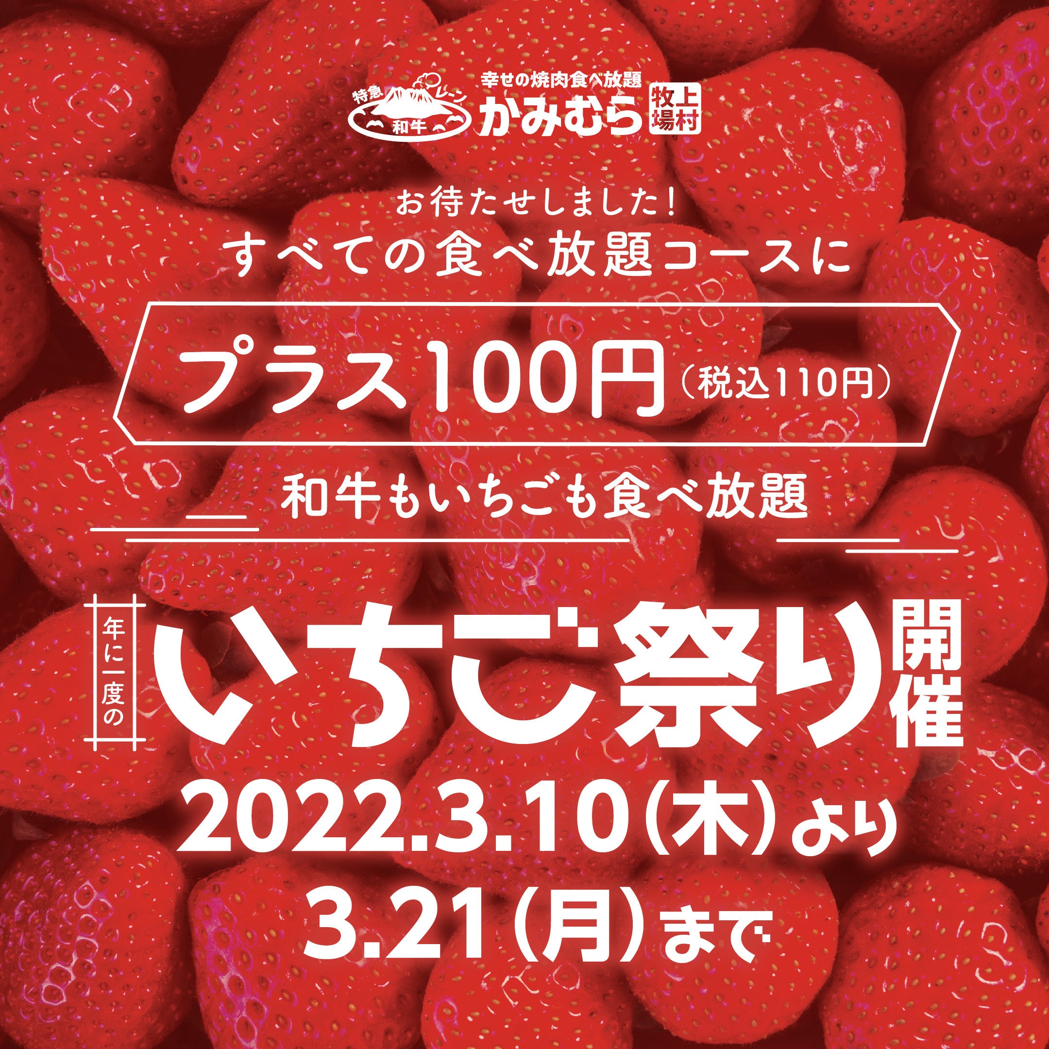ワタミ株式会社(本社:東京都大田区、以下ワタミ)の展開する幸せの焼肉食べ放題「かみむら牧場」で、2022年3月10日(木)から3月21日(月)までの期間、すべての食べ放題コースに追加料金100円(税込110円)でいちごが食べ放題でお楽しみいただける「いちご祭り」を実施いたします。