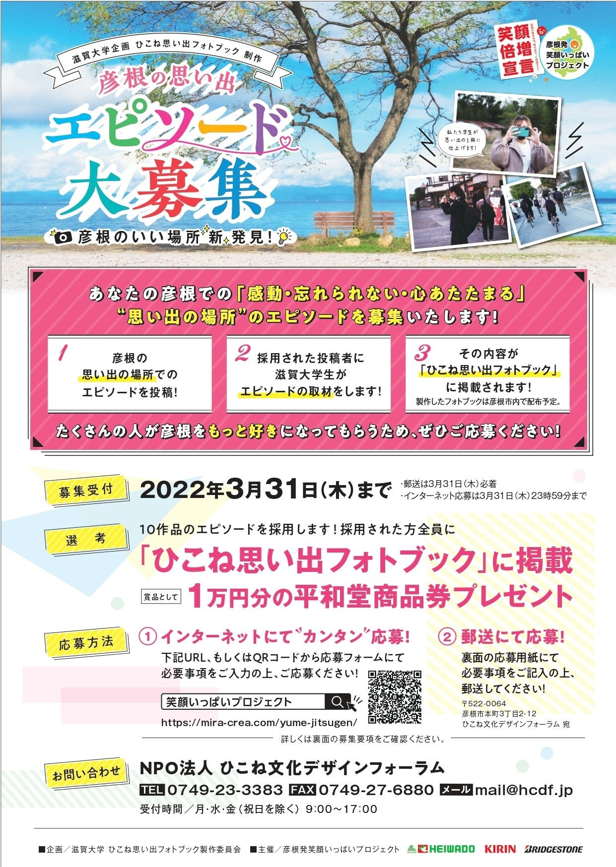 平和堂、キリン(滋賀工場)、 ブリヂストン(彦根工場)は、「彦根発 笑顔いっぱいプロジェクト」の取り組みとして滋賀大学と連携し、このたび「ひこね思い出フォトブック」の制作にあたり、彦根の“思い出の場所”での感動・忘れられない・心あたたまるエピソードを、2022年3月31日(木)まで募集しますのでお知らせいたします。