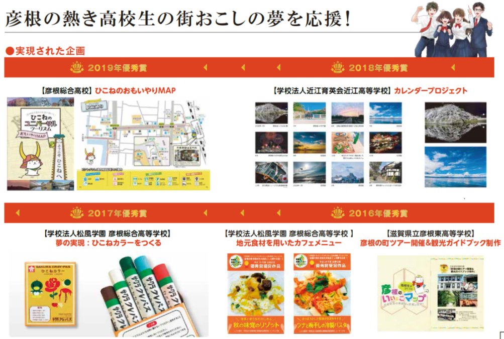 これまで4回の実施で合計531件の応募をいただき、「彦根の町ツアー開催&観光ガイドブック制作」・「地元食材を用いたカフェメニュー」(2016年)、「ひこねカラーをつくる」(2017年)、「カレンダープロジェクト」(2018年)、「ひこねのユニバーサルツーリズム(おもいやりMAP)」(2019年)を優秀賞とし、企画の実現をサポートしました。