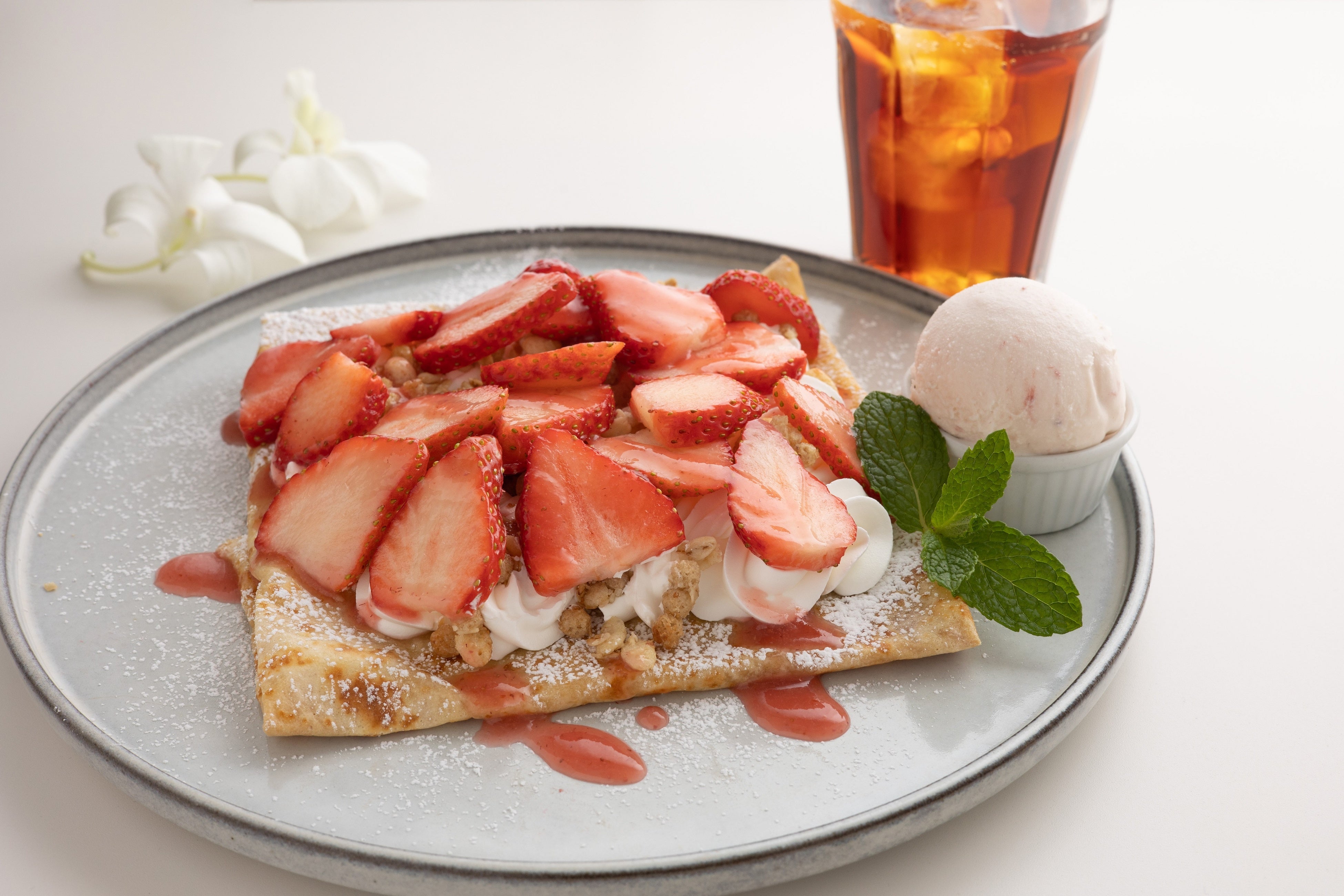 ⾃家製の苺ピューレとカスタードをたっぷりとクレープに挟み、上品な⽢さのホイップクリームの上に真っ⾚に完熟した⼤きな苺を贅沢にトッピングしたビジュアルも可愛い、春にぴったりな⼀品。思う存分、苺を味わって頂けます。