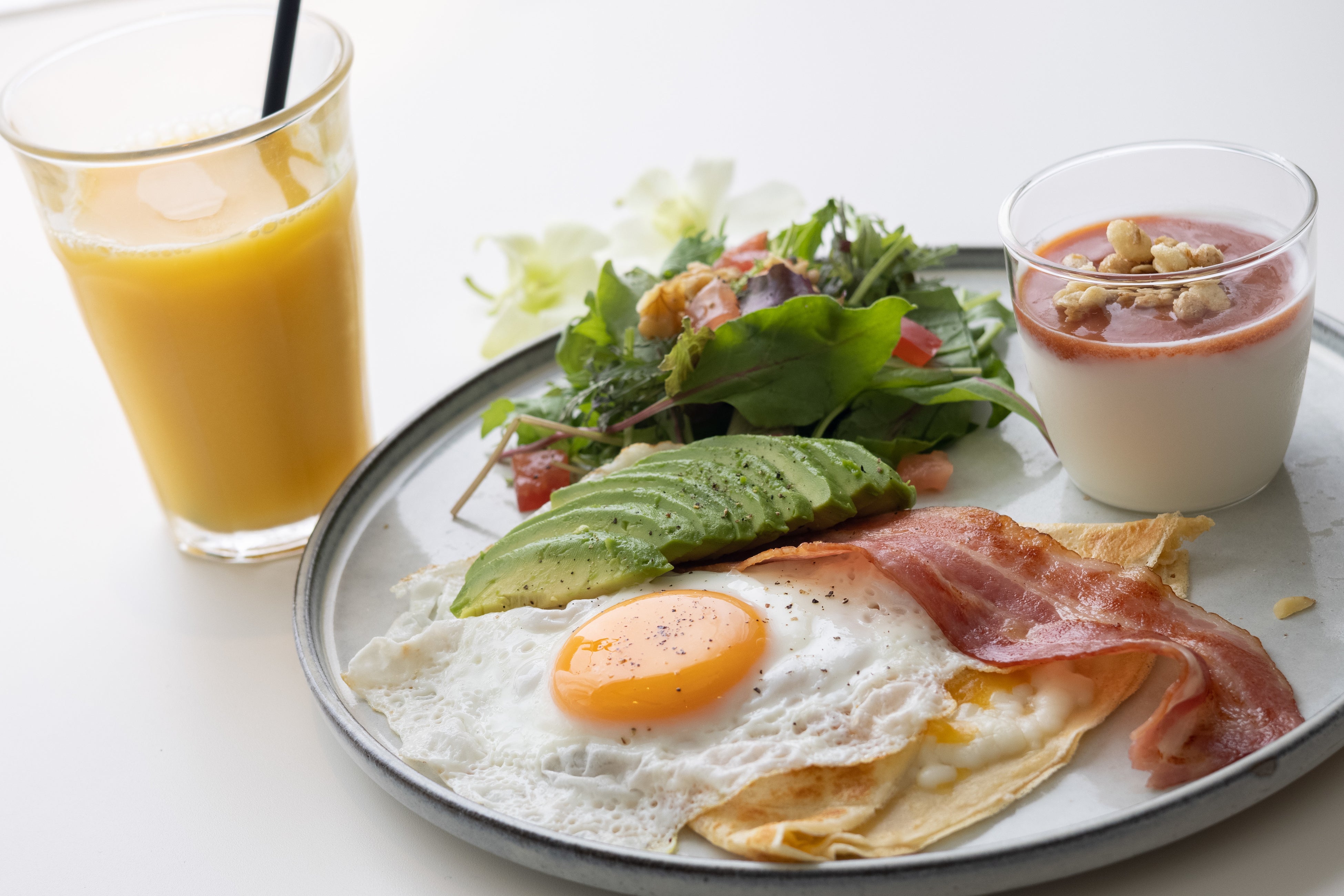 平⽇10⾷限定のモーニングプレートには、シンプルなチーズのクレープに⽬⽟焼き、ベーコン、アボカドの間違いない組み合わせをトッピング。サラダとたっぷりなヨーグルトも添え、元気な1⽇を迎えるのに最適なワンプレートです。