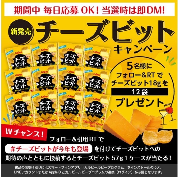 さらに、Wチャンスとして、「#チーズビットが今年も登場」を付けて「チーズビットへの期待の声」とともに引用リツイート投稿した方の中から抽選で5名様に『チーズビット 濃厚チェダーチーズ味』(57g)12袋をプレゼントします。